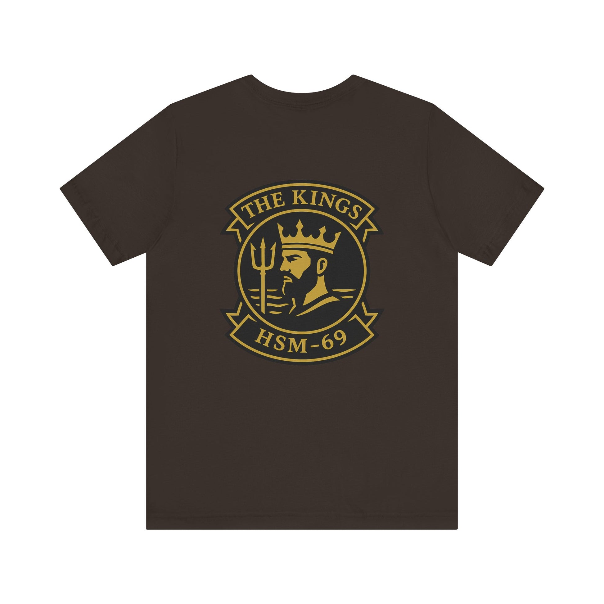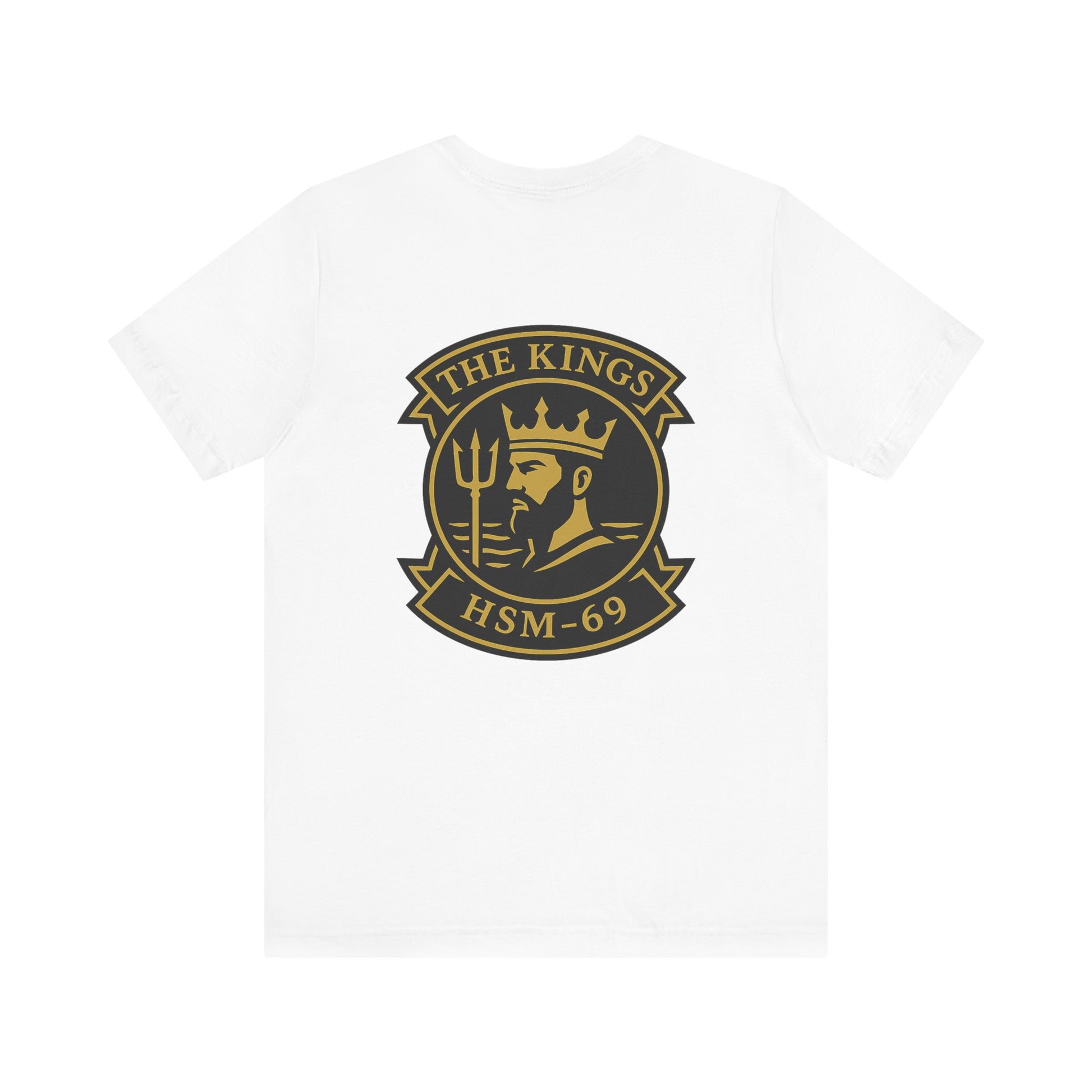 A clean, comfortable short-sleeve tee that carries a bold, maritime-inspired emblem — a crowned trident-wielding king rendered in rich gold-on-black tones. The emblem sits small over the left chest and larger across the back, giving the shirt a confident, club-like identity without feeling loud. Lightweight Airlume combed cotton keeps the tee breathable and easy to layer. Details like a ribbed knit collar, shoulder tape, and side seams mean it holds shape through wear and washing. This shirt slips into everyday rotation for anyone who wants a subtle statement piece that reads classic and purposeful — wear it to shore-side meetups, crew nights, or whenever you want an elevated casual look with a nautical edge.